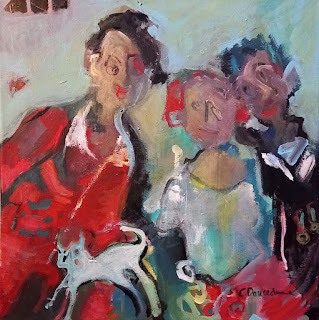 Ma peinture s'inspire de scènes de vie contemporaines. Je tends à simplifier mes personnages jusqu'à la caricature. J'aime quand ils évoluent librement au milieu de décors abstraits.